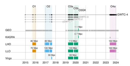 La collaboration LIGO-Virgo-KAGRA (LVK) publie la nouvelle version (4.0) du catalogue de signaux transitoires d’ondes gravitationnelles (GWTC-4.0) et une série d’articles thématiques correspondant aux nouvelles données, enregistrées entre mai 2023 et janvier 2024, ce qui correspond à la première partie de la quatrième période d’observation (O4a). Ces articles sont soumis à la revue Astrophysical Journal pour publication sous forme d'un numéro spécial.