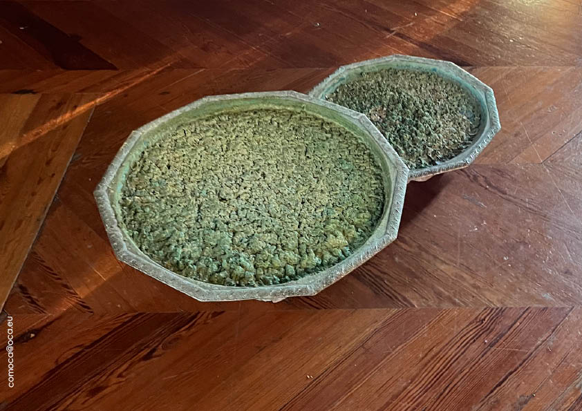 Célia Cassaï, Plateaux calcaires, Plateaux en cuivre, coquilles d’oeufs, vinaigre blanc,